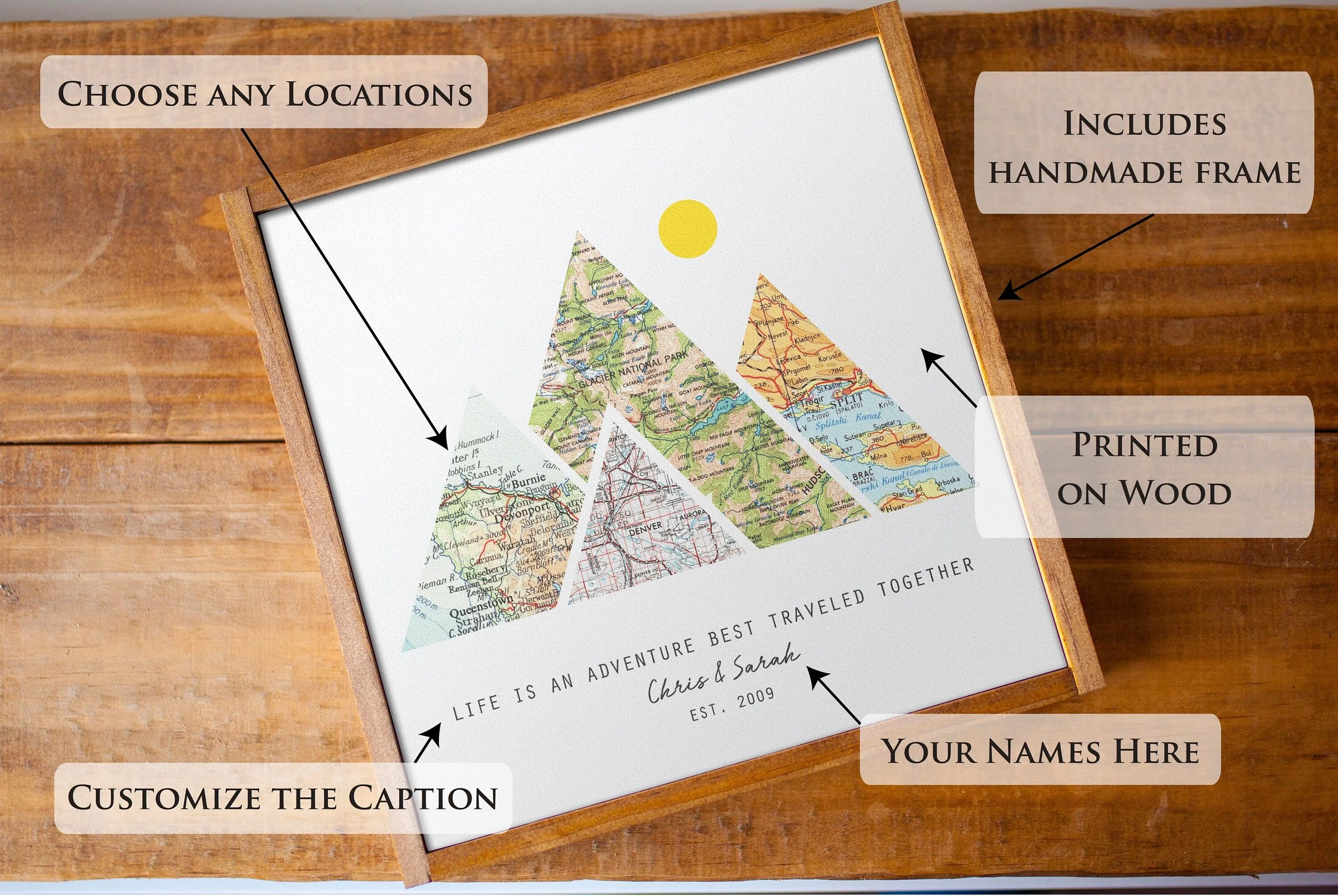 Adventure Awaits! Cherish your journey together with a beautiful custom map gift, printed directly on wood! Personalize your wood mountain wall art with any specific locations in the world and two names and a date or caption of your choice to create the perfect couples gift & travel decor.