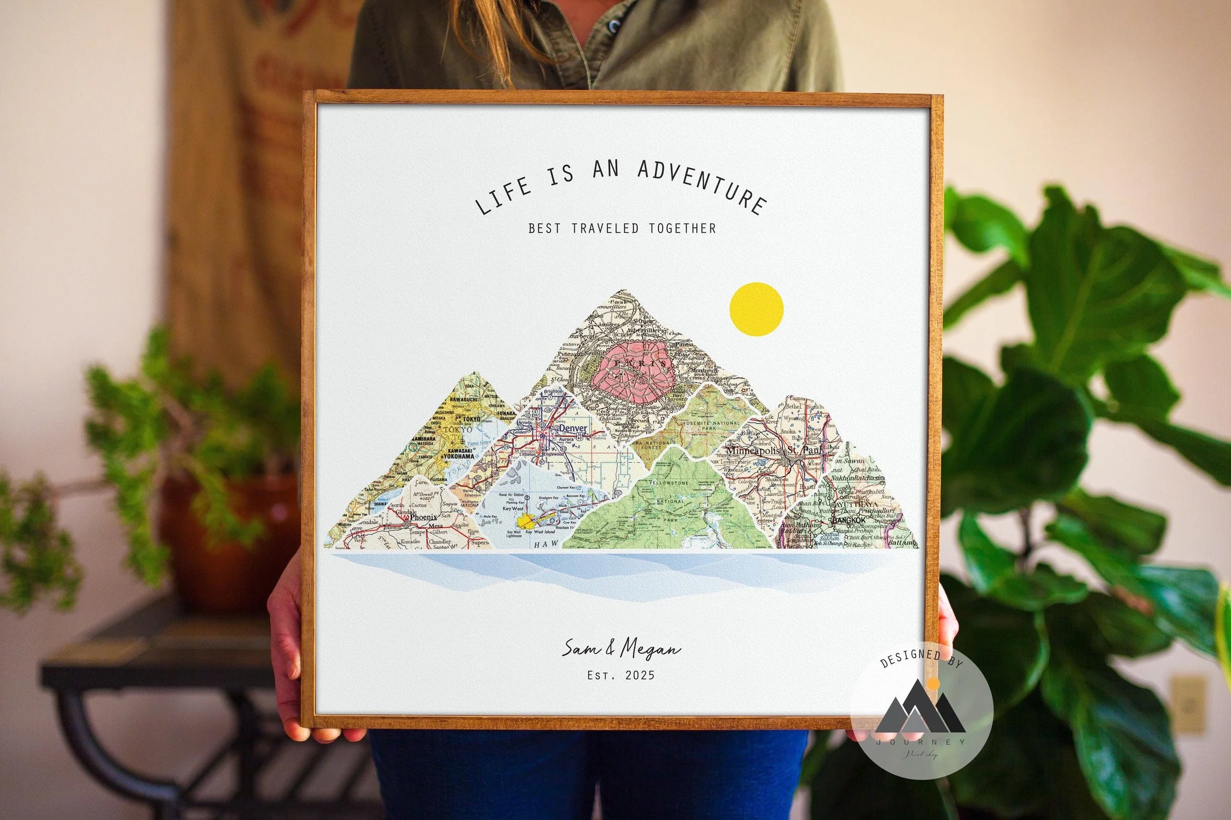 Adventure Awaits! Cherish your journey together with a beautiful custom map gift, printed directly on wood! Personalize your wood mountain wall art with any specific locations in the world and two names and a date or caption of your choice to create the perfect couples gift & travel decor.
