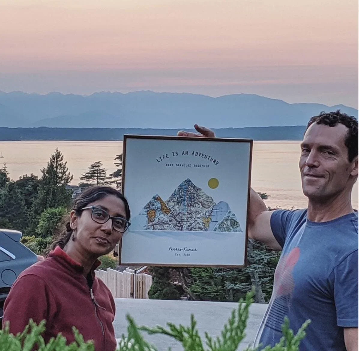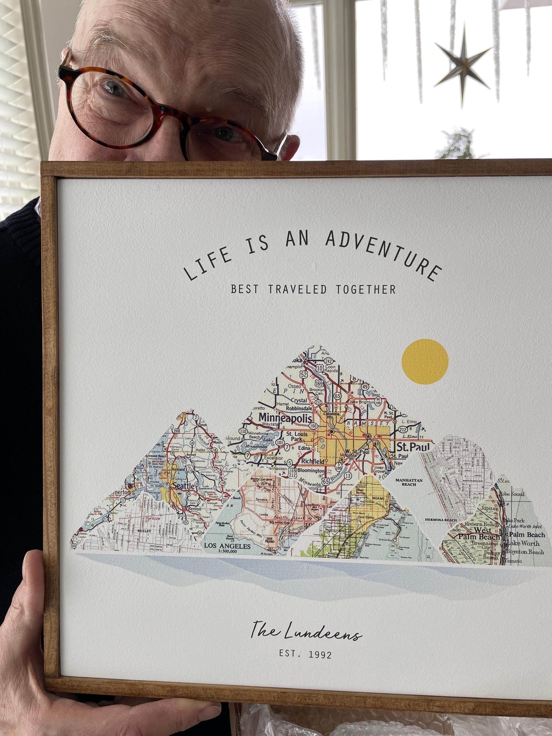 This custom map art print makes unique travel-inspired engagement or wedding gift ideas for couples, 5th anniversary or birthday gifts for him (or 50th anniversary as gifts for parents!), personalized gifts for husband, wife, groom gift, or birthday gift for him or her. Our travel gifts feature favorite vacation spots, engagement/wedding/honeymoon locations, places lived, or places yet to go - the possibilities are endless!