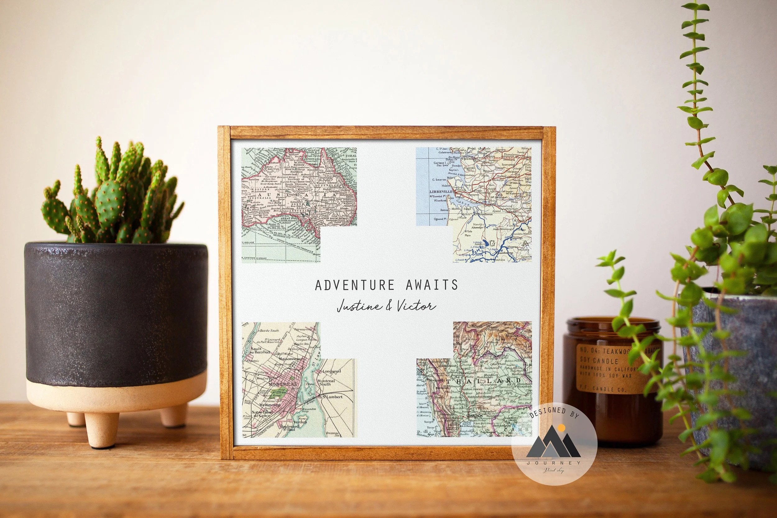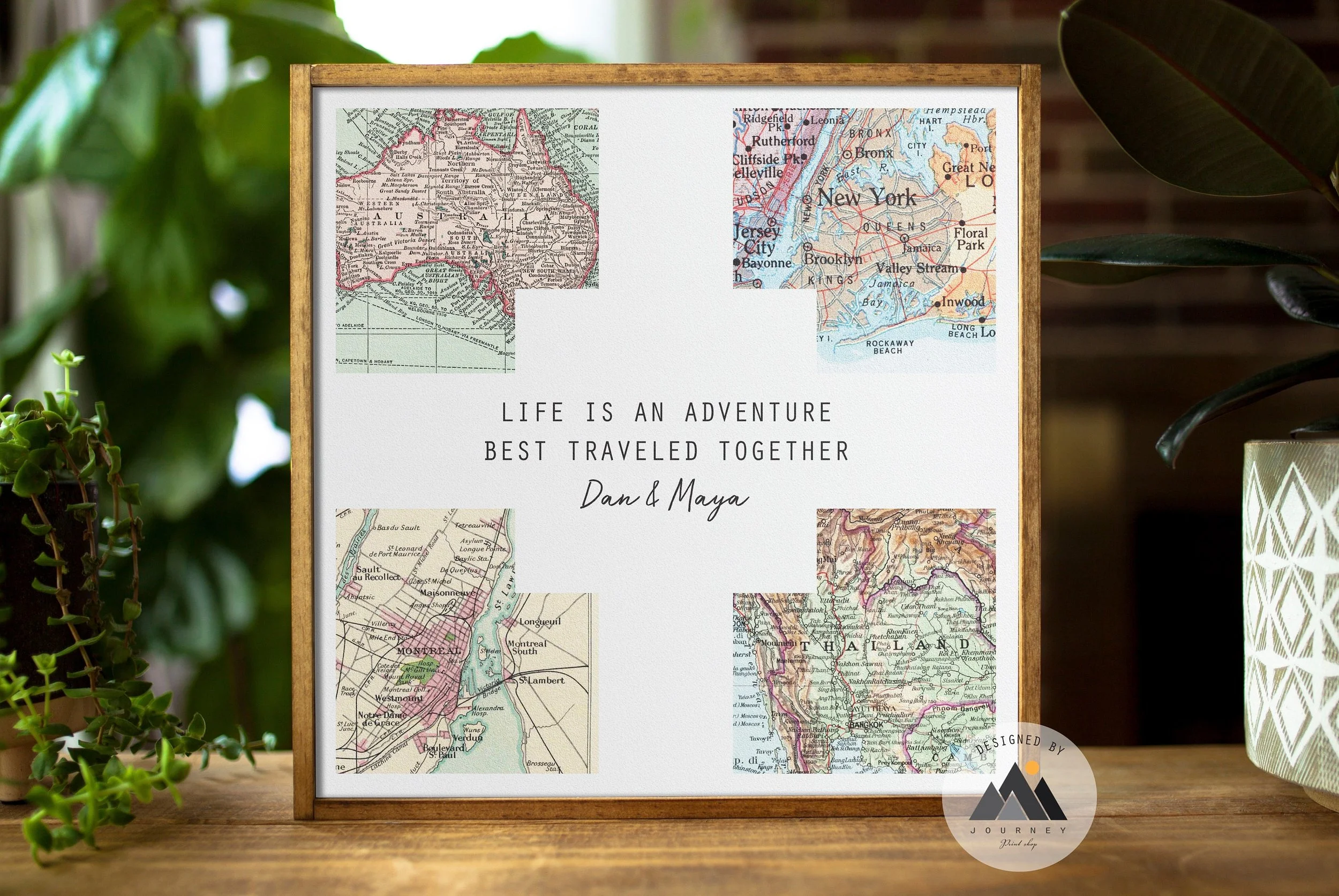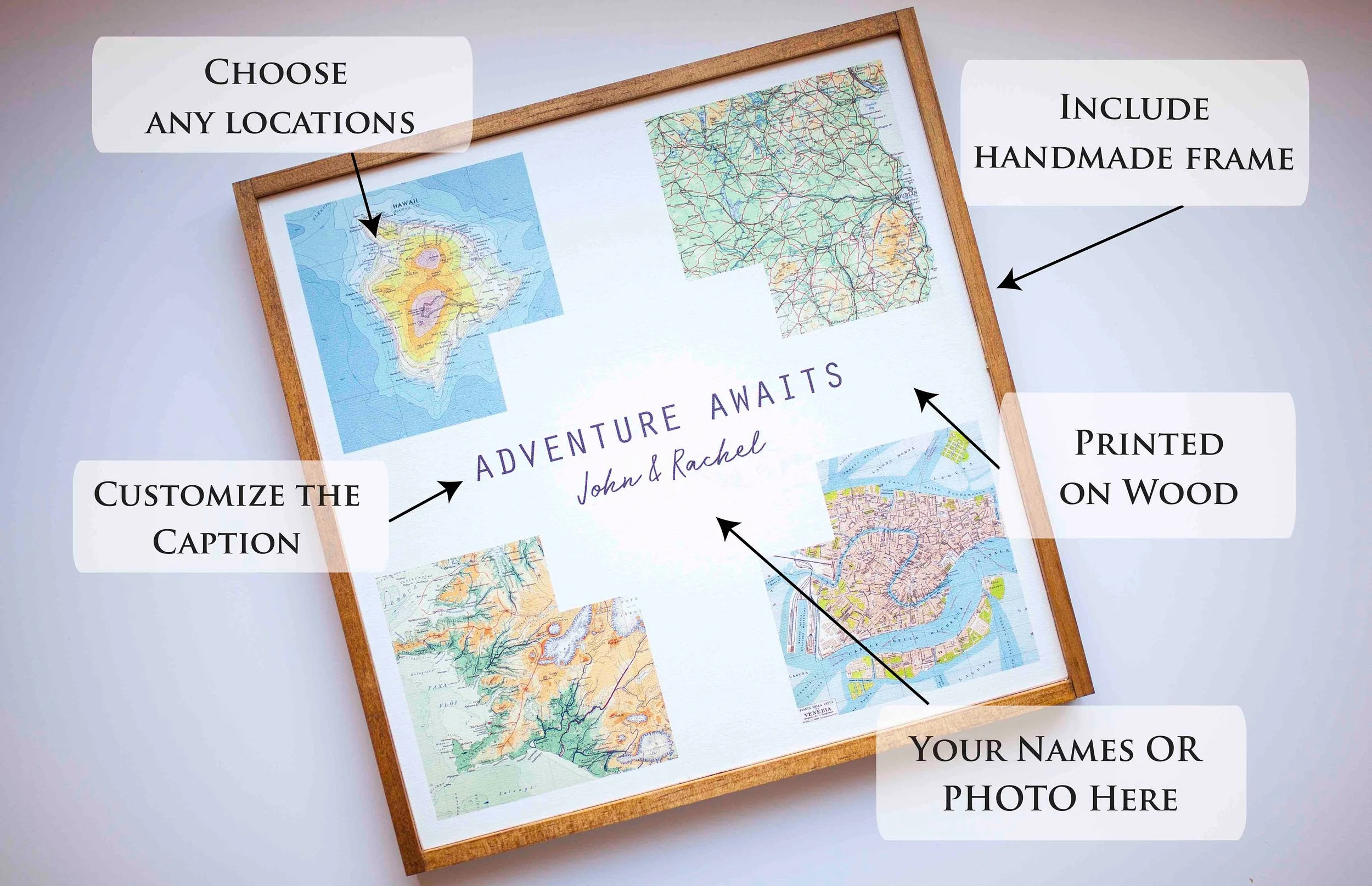 Adventure Awaits! Cherish your journey together with a beautiful custom map gift, printed directly on wood! Personalize your wood wall art with any specific locations in the world and two names and a date or caption of your choice to create the perfect couples gift & travel decor.