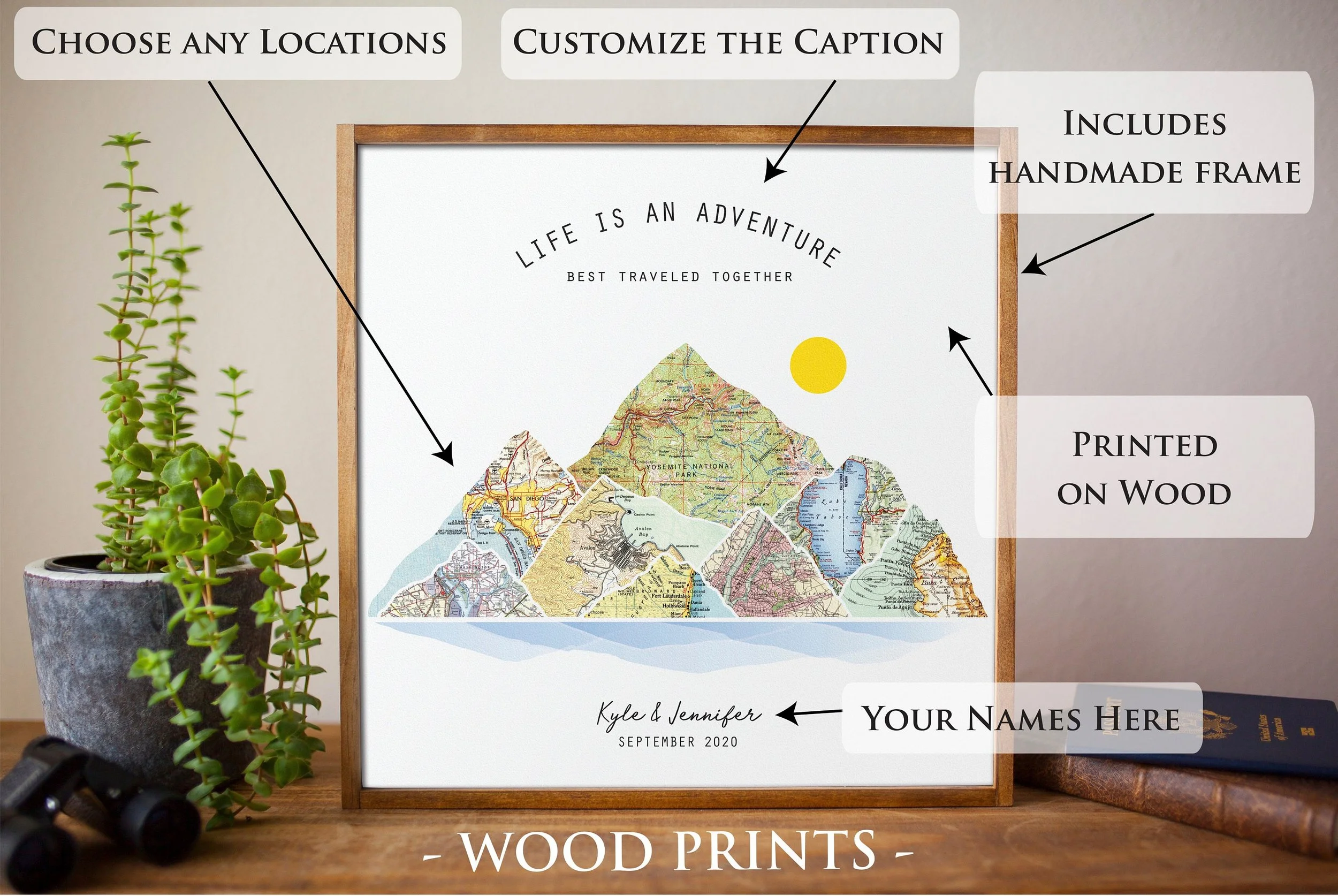 Adventure Awaits! Cherish your journey together with a beautiful custom map gift, printed directly on wood! Personalize your wood mountain wall art with any specific locations in the world and two names and a date or caption of your choice to create the perfect couples gift & travel decor.