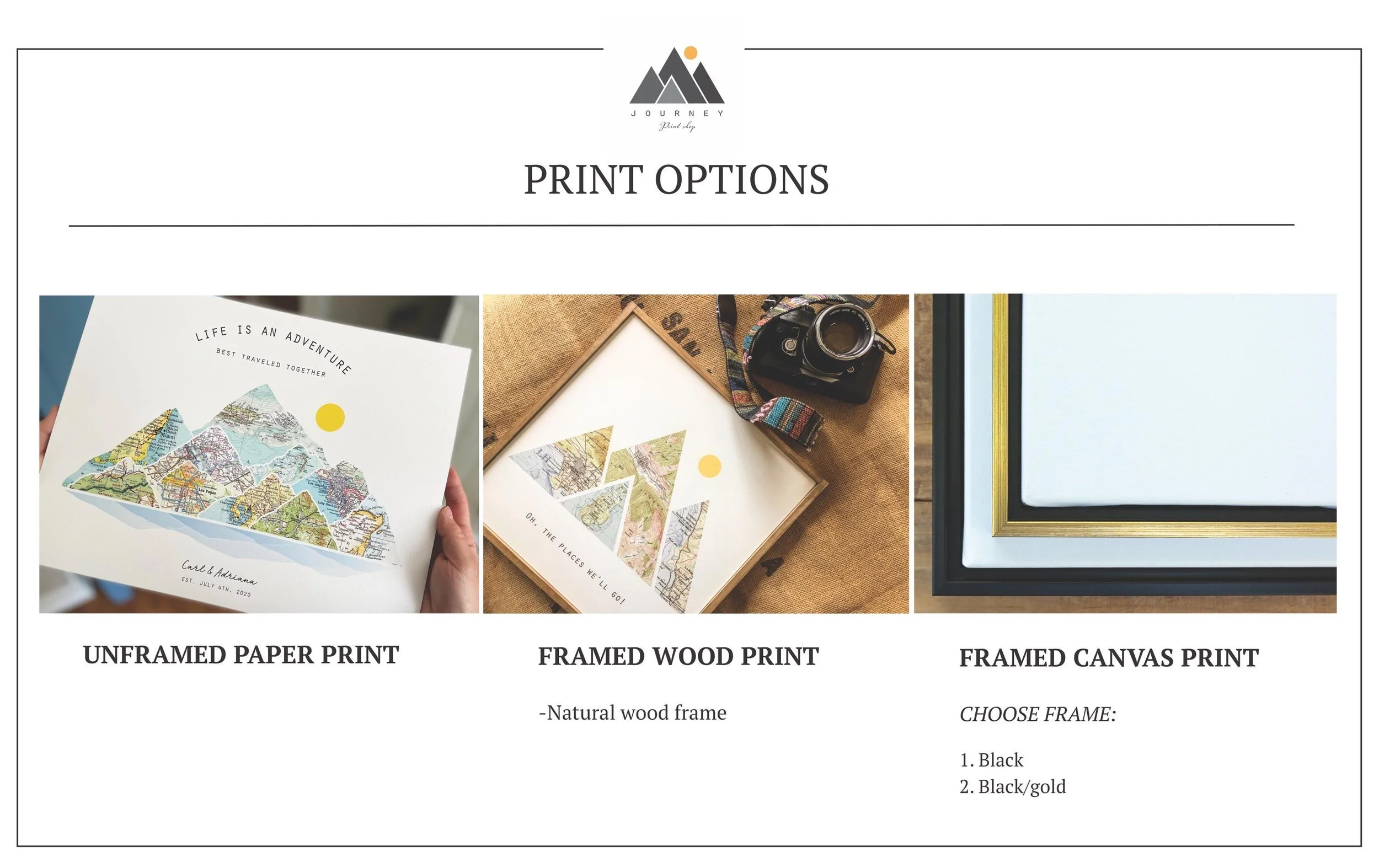3. Select frame color (Wood prints come with a natural wood frame, canvas prints have two float frame options: gold/black or black)