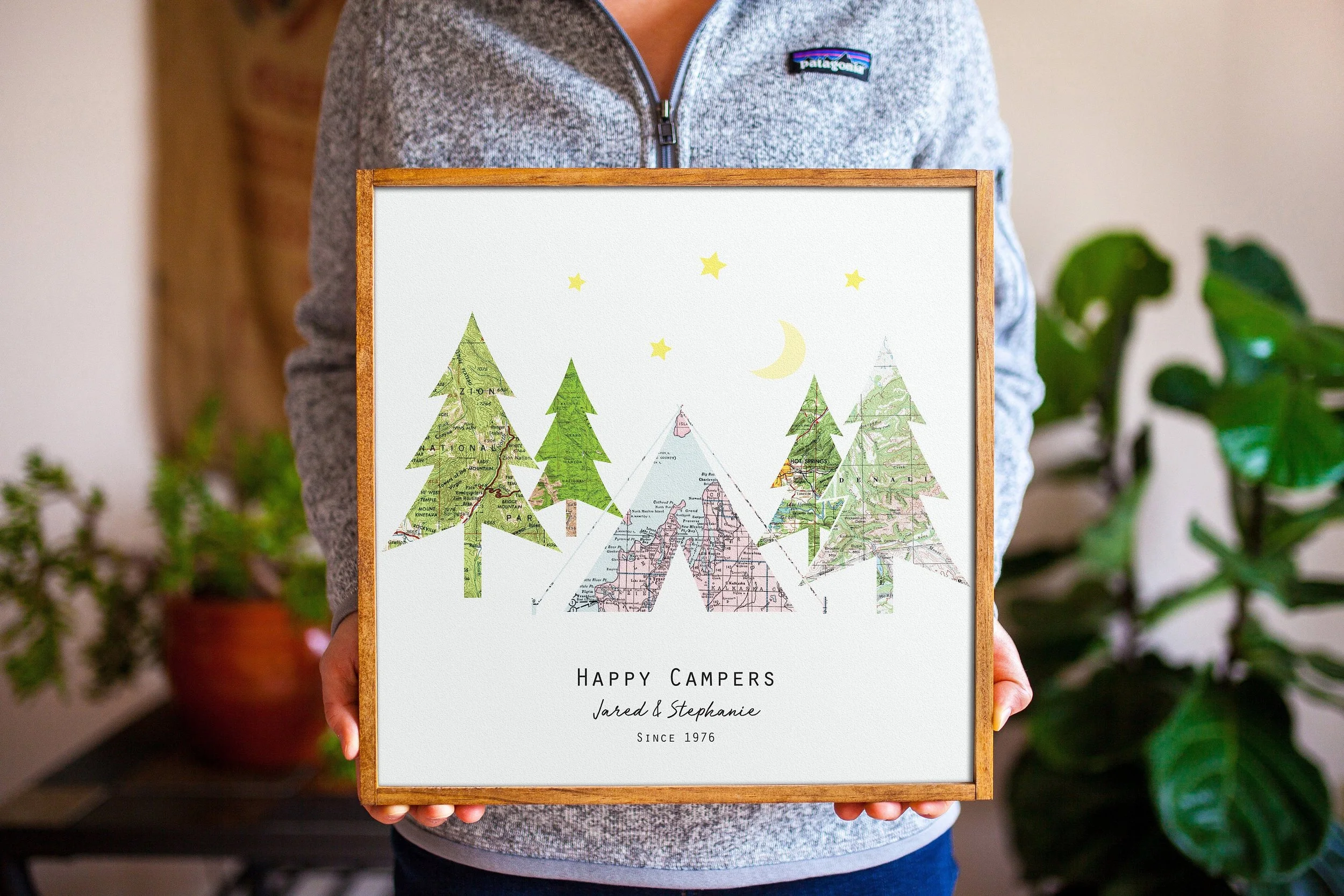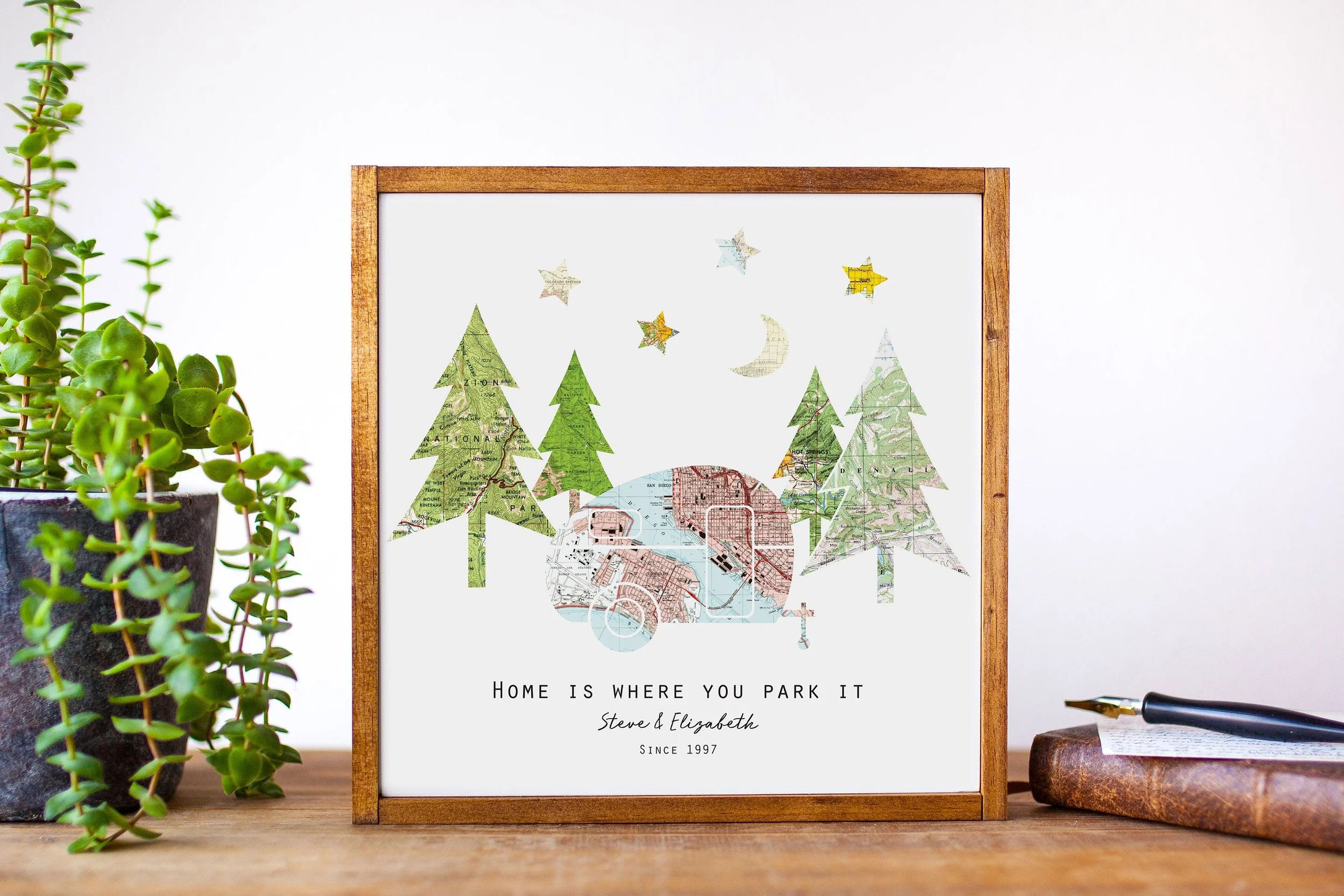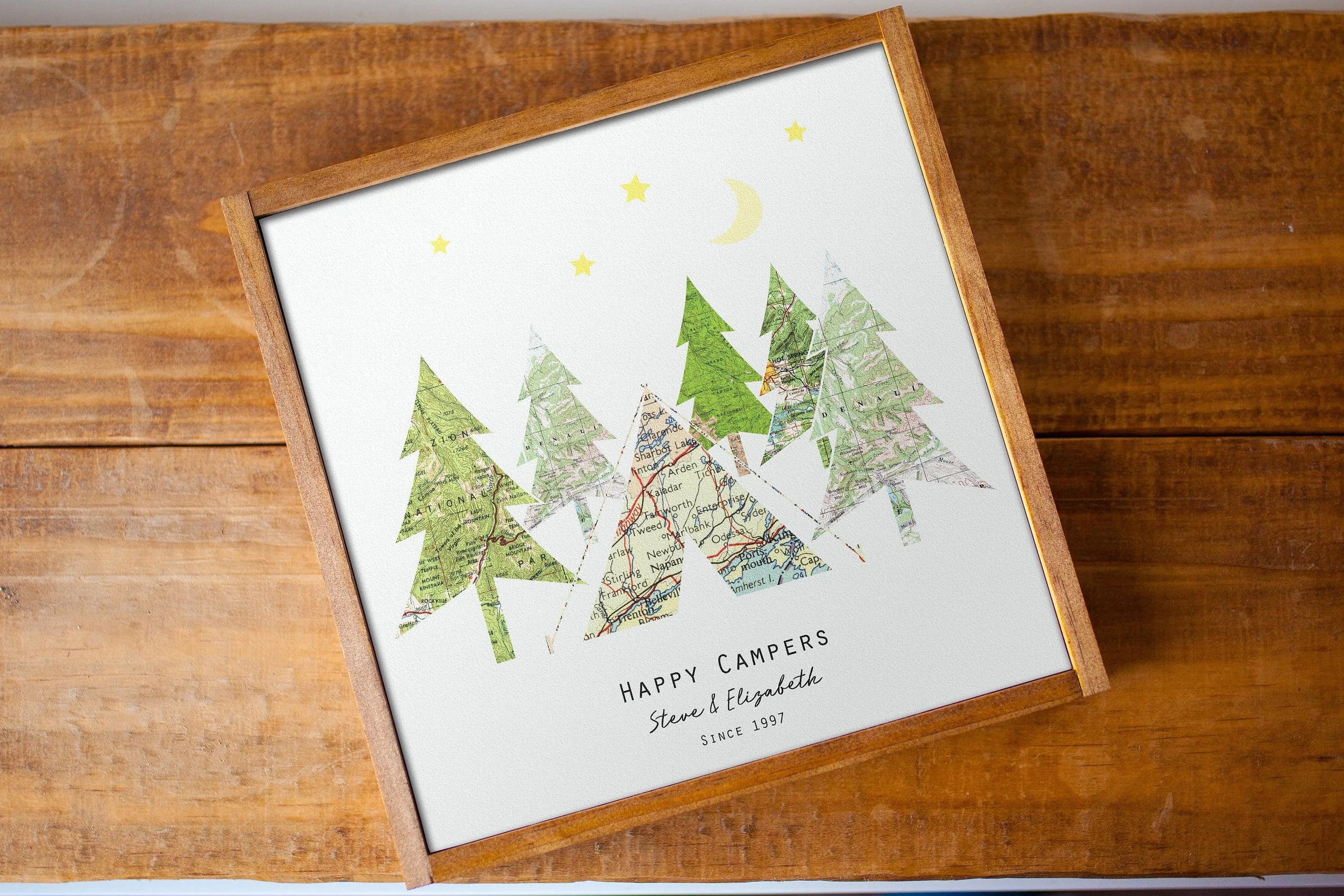 This personalized map art will make the most thoughtful camping/hiking-inspired couples engagement gifts, wedding gifts, anniversary gifts, or birthday gifts for him, husband, wife, or family member. Our travel gifts make unique camping signs or travel decor for the camp-happy couple. Feature favorite vacation spots, engagement/wedding/honeymoon locations, places lived, or places yet to go - the possibilities are endless!