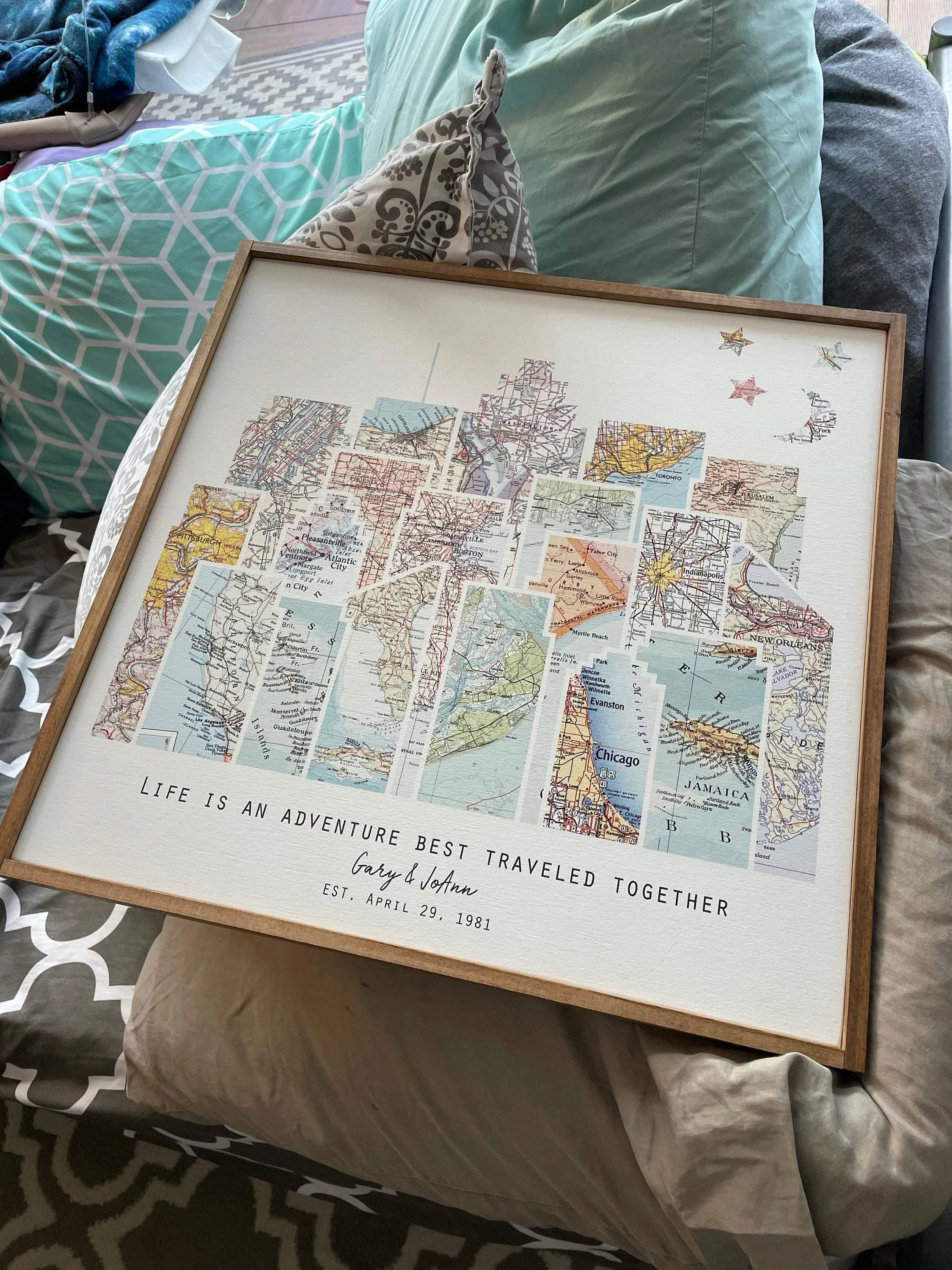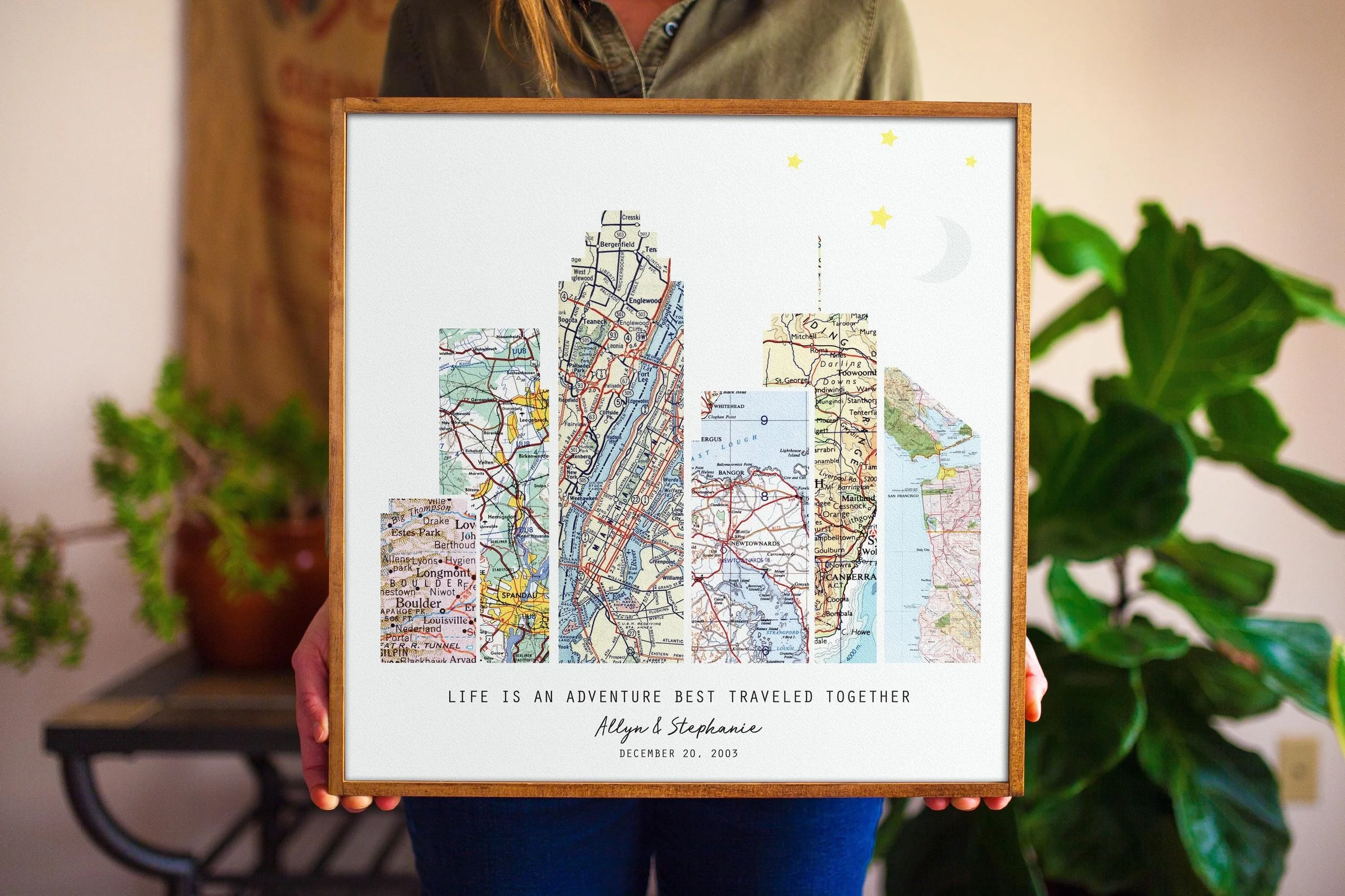 This personalized map art will make the most thoughtful travel-inspired engagement gifts, wedding gifts, 5th anniversary gifts for him (or 50th anniversary!), or birthday gifts for your husband, wife, or favorite adventure couple. Feature favorite vacation spots, engagement/wedding/honeymoon locations, places lived, or places yet to go - the possibilities are endless! Can also be used as wedding signs if you're looking for travel-themed wedding decor.