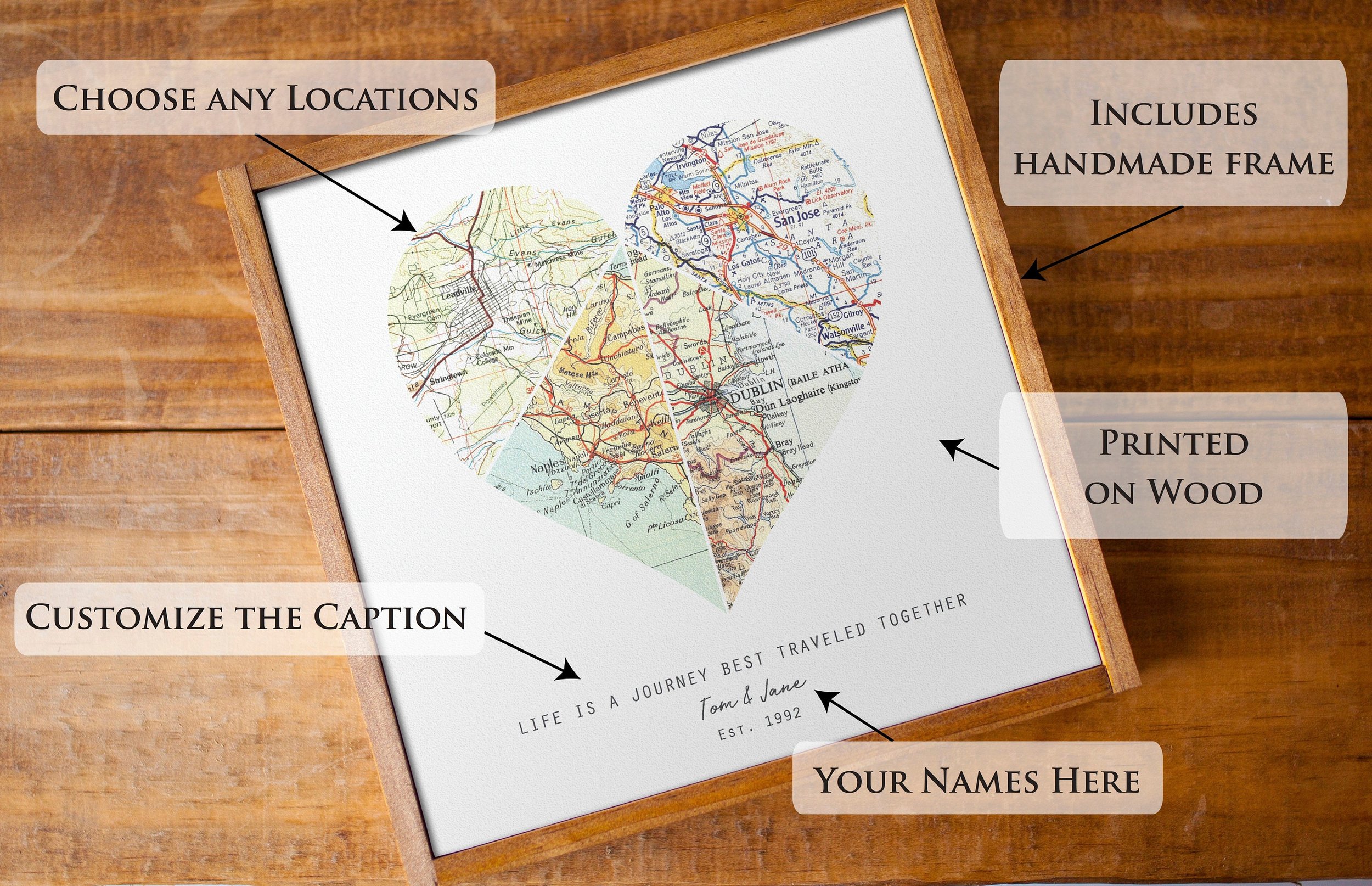 Cherish your journey together with a beautiful custom travel map gift. Personalize our custom wood signs with any specific locations in the world and the caption of your choice.
