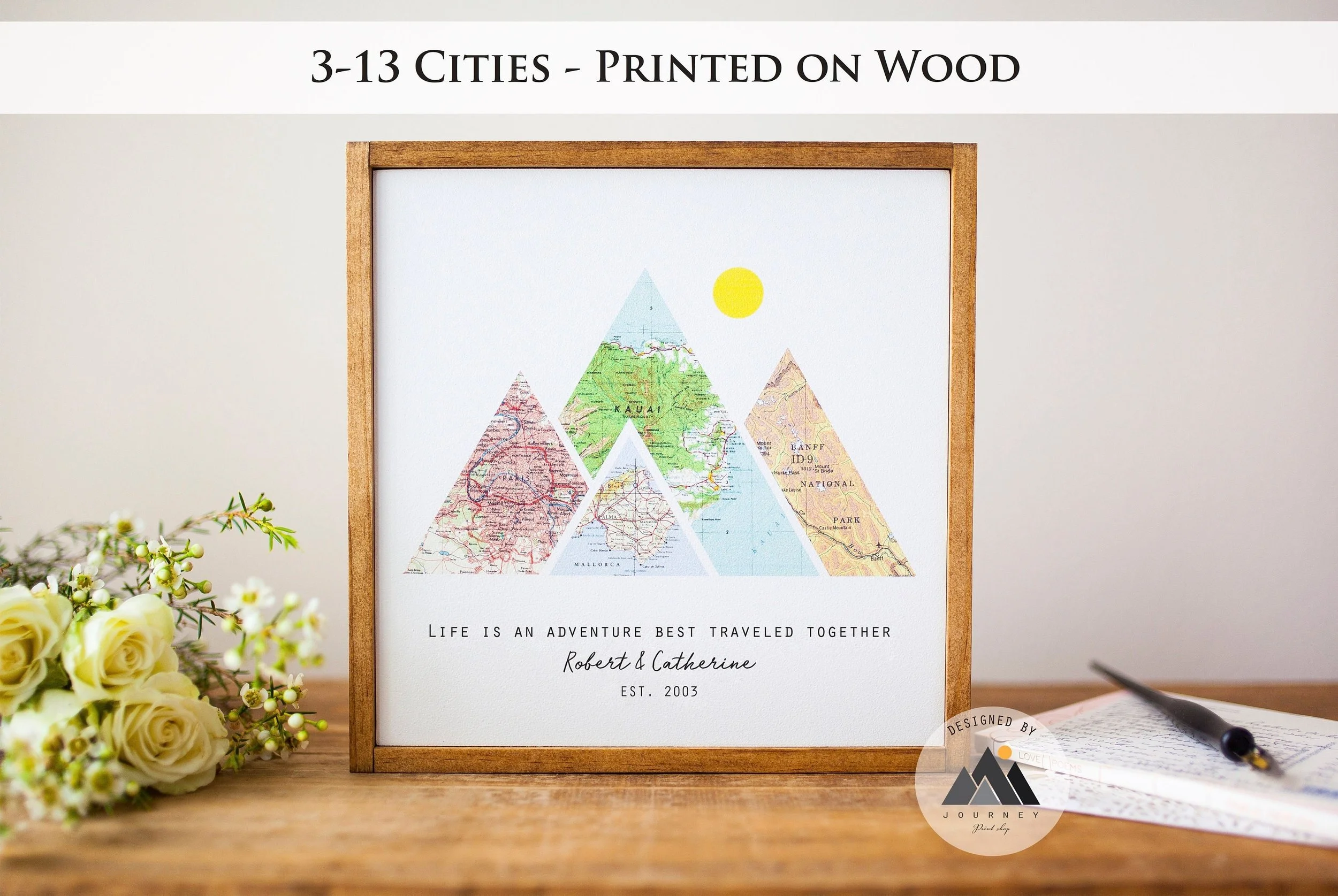 Adventure Awaits! Cherish your journey together with a beautiful custom map gift, printed directly on wood! Personalize your wood mountain wall art with any specific locations in the world and two names and a date or caption of your choice to create the perfect cute couples gifts & travel decor.