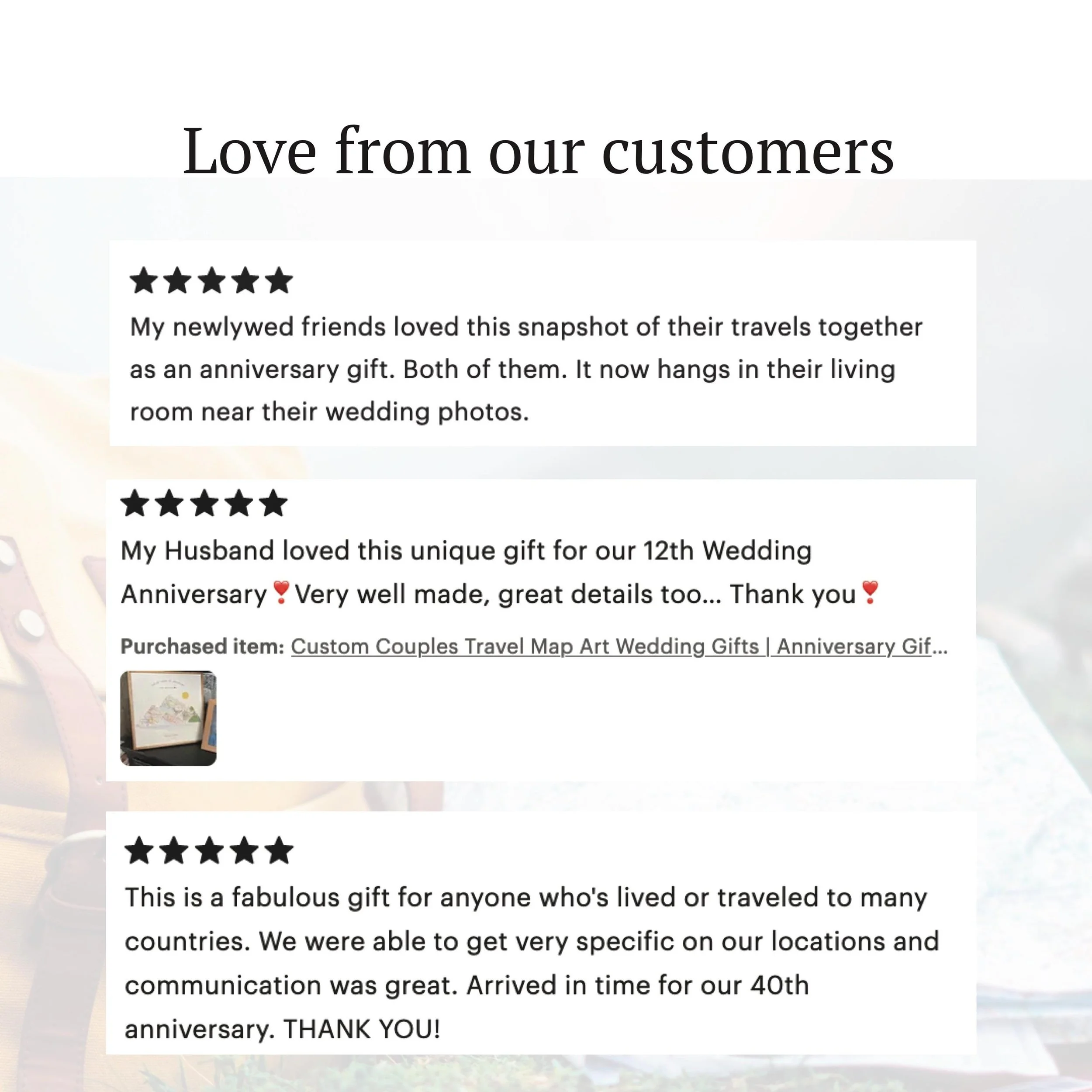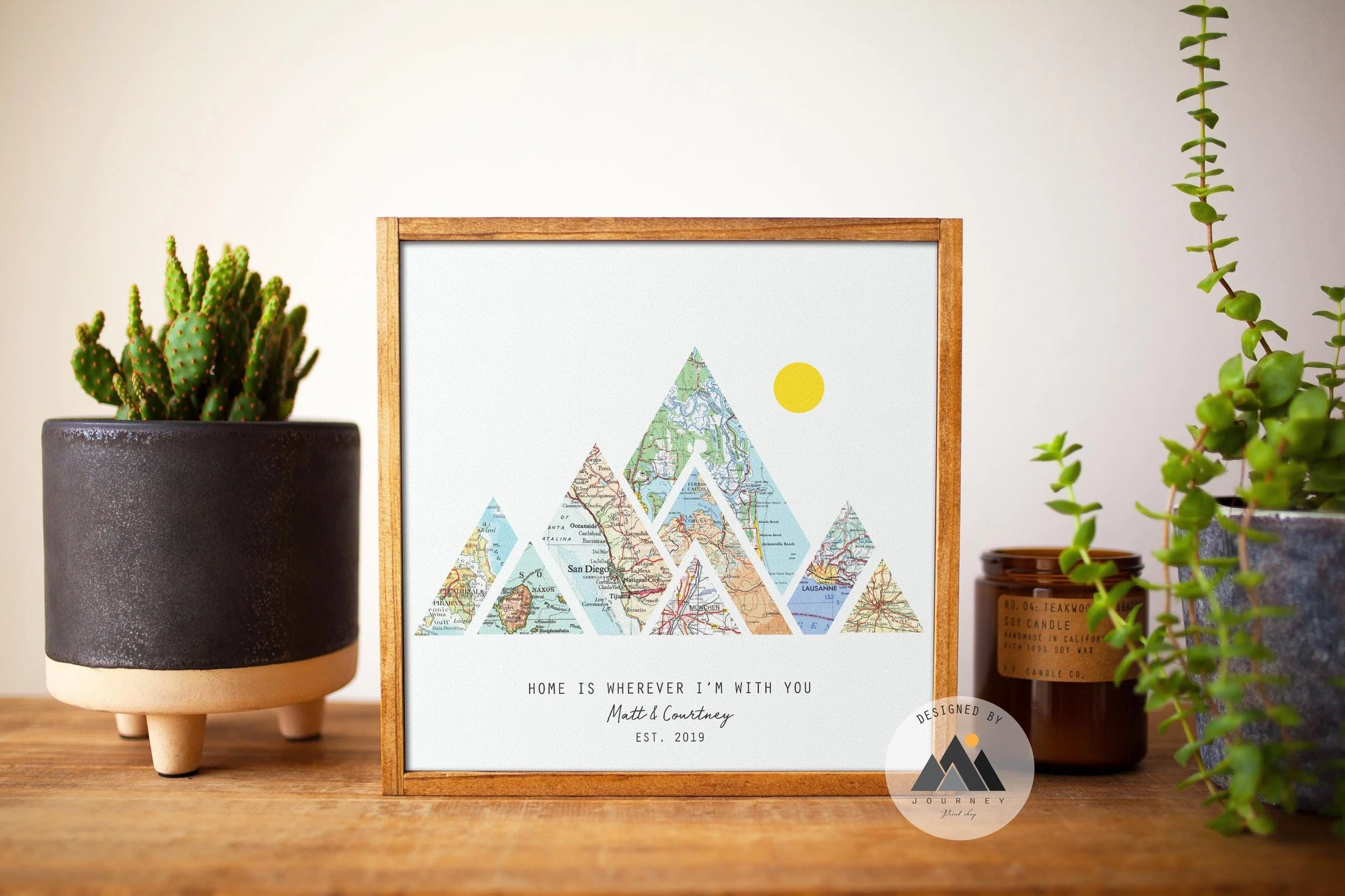 This custom map art print makes unique travel-inspired engagement or wedding gifts for couple, 5th anniversary gifts for him/her (or 50th anniversary as gifts for parents!), personalized Christmas gifts for husband, wife, sister in law, groom gift, or birthday gift for him/her. Our travel print gifts feature favorite national park maps, vacation spots, engagement/wedding/honeymoon locations, places lived, or places yet to go - the possibilities are endless!