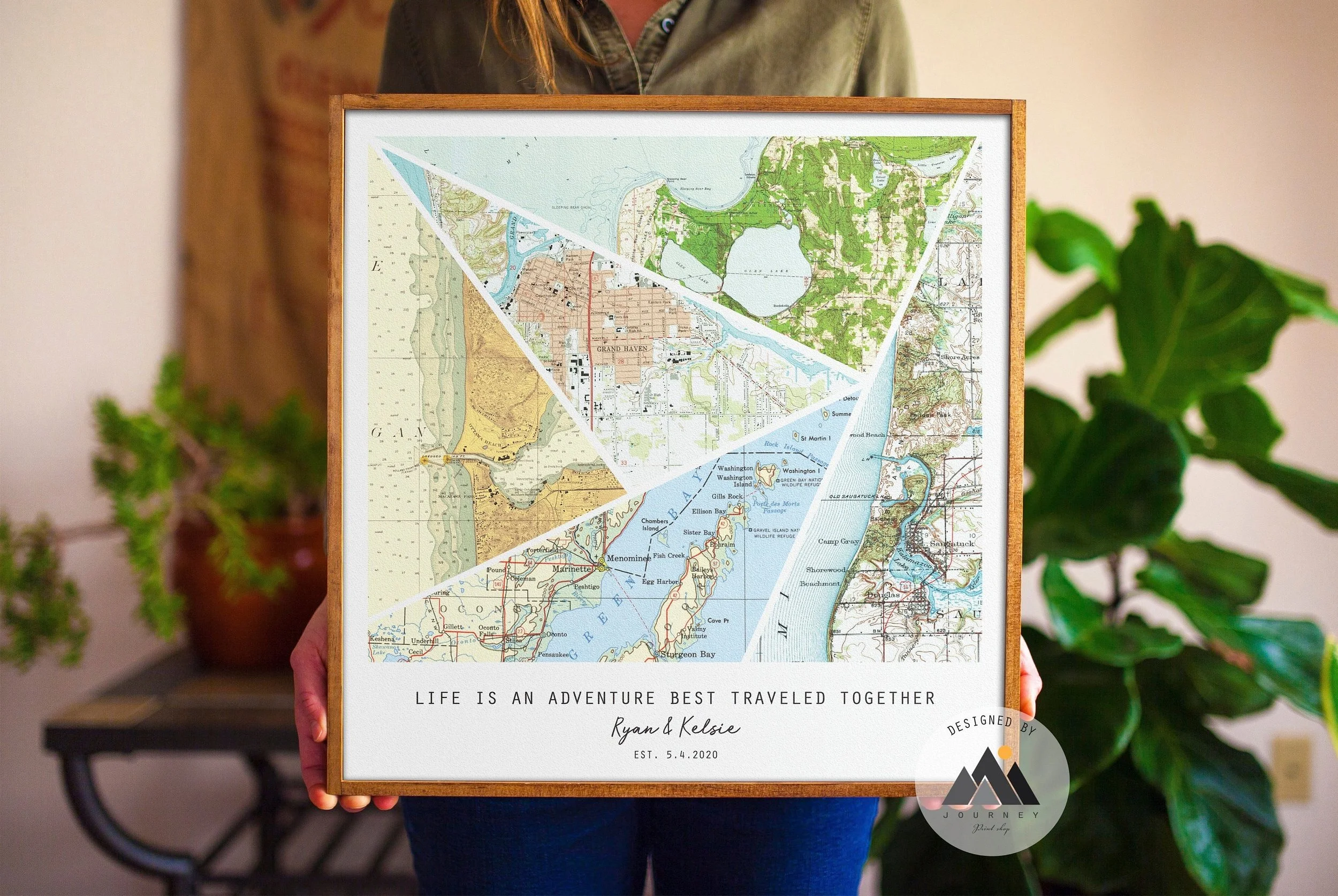 Cherish your journey together with a beautiful custom travel map, printed directly on wood! Personalize your framed geometric wood wall art with any specific locations in the world and two names and a date or caption of your choice.