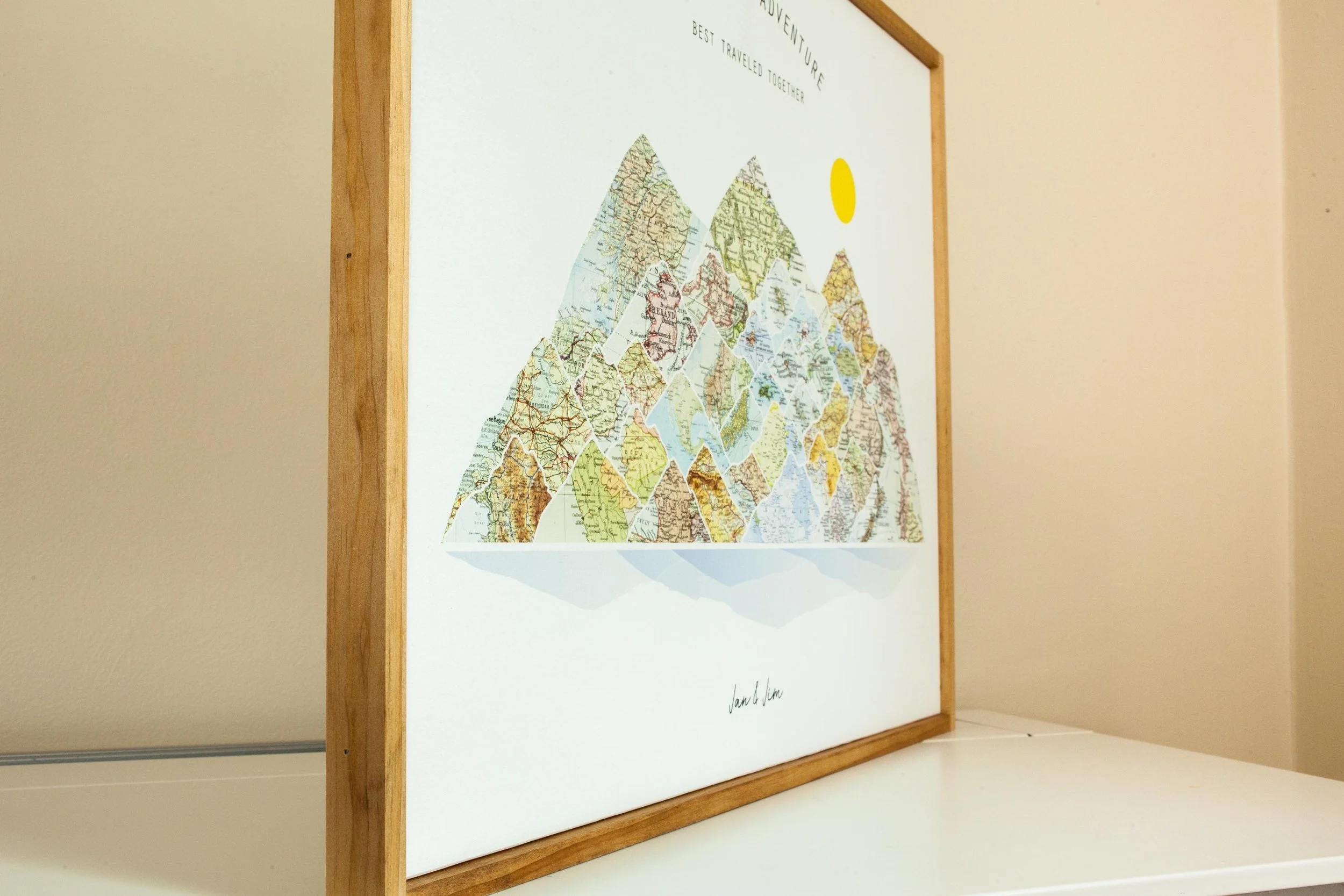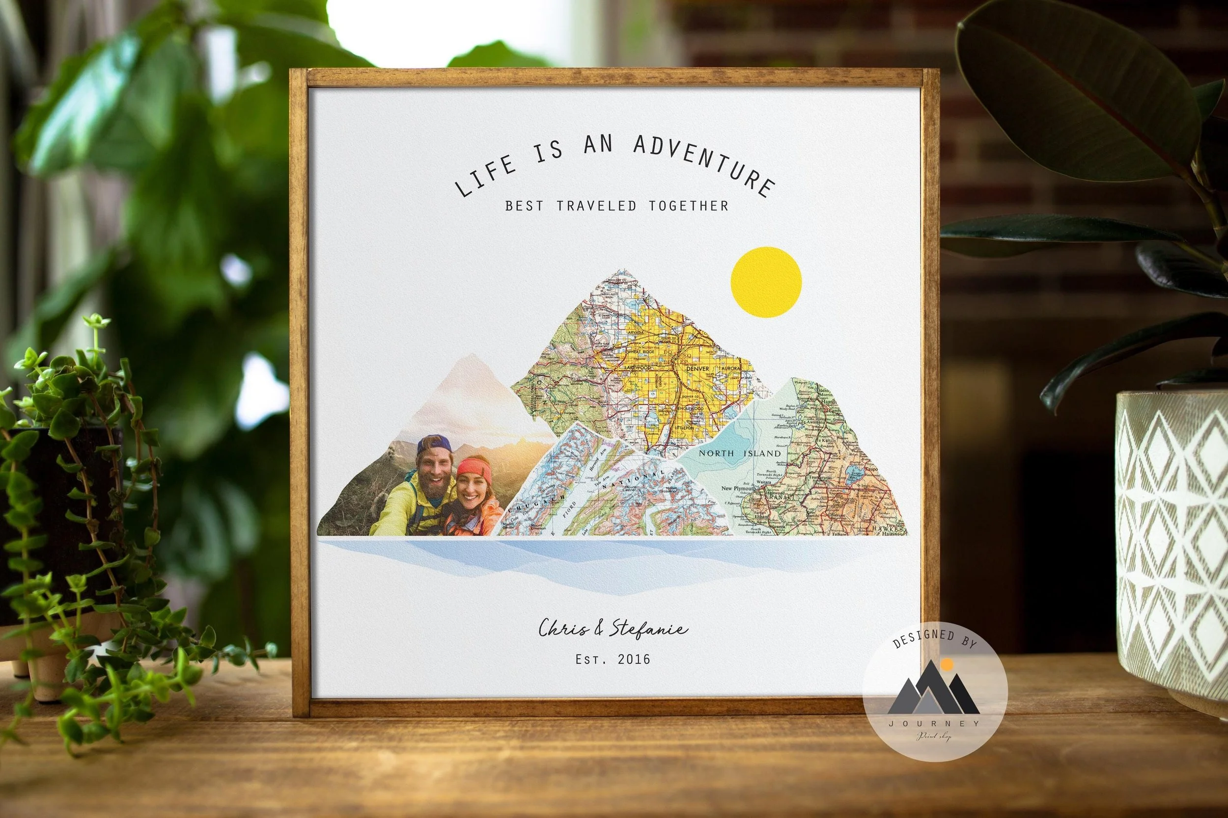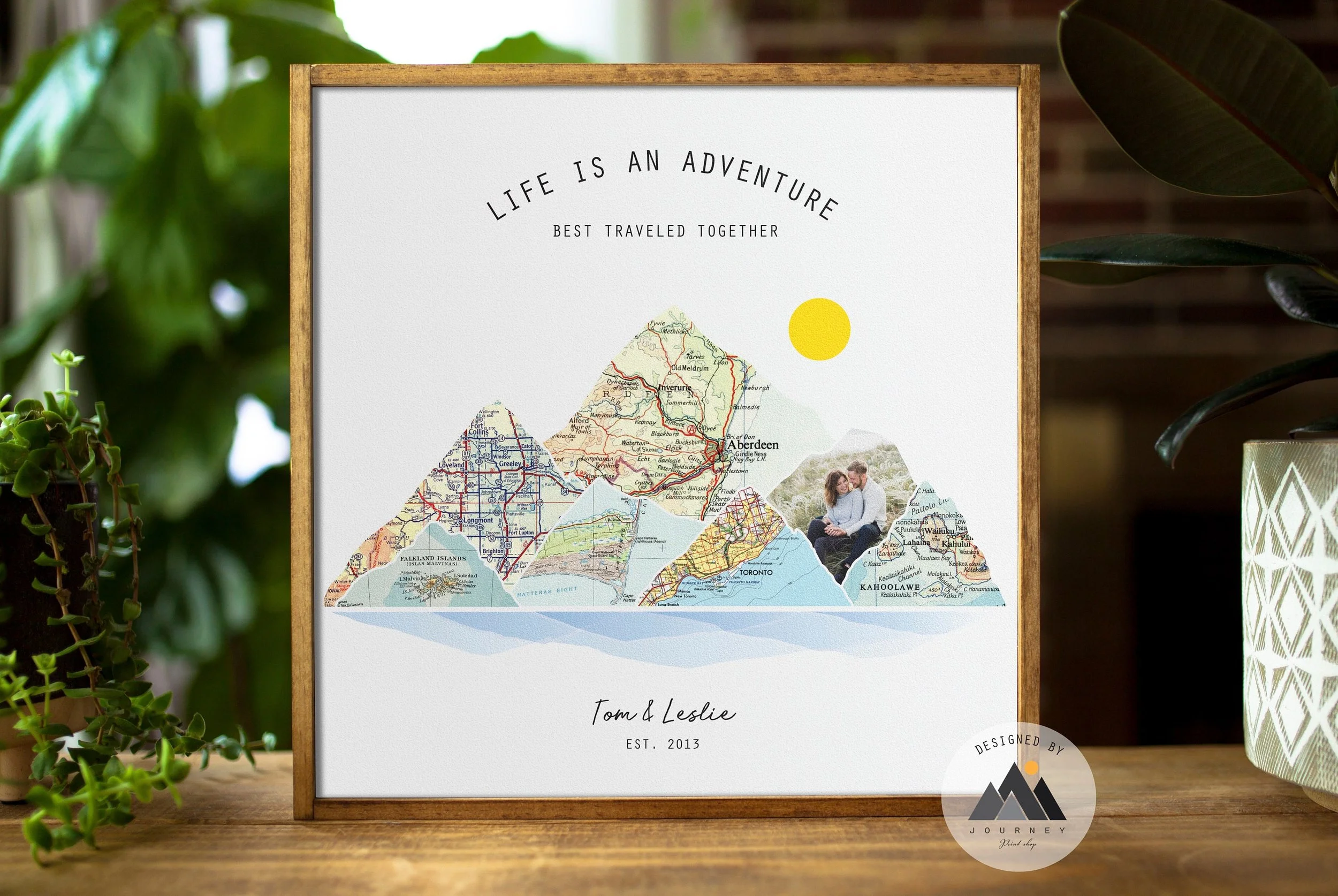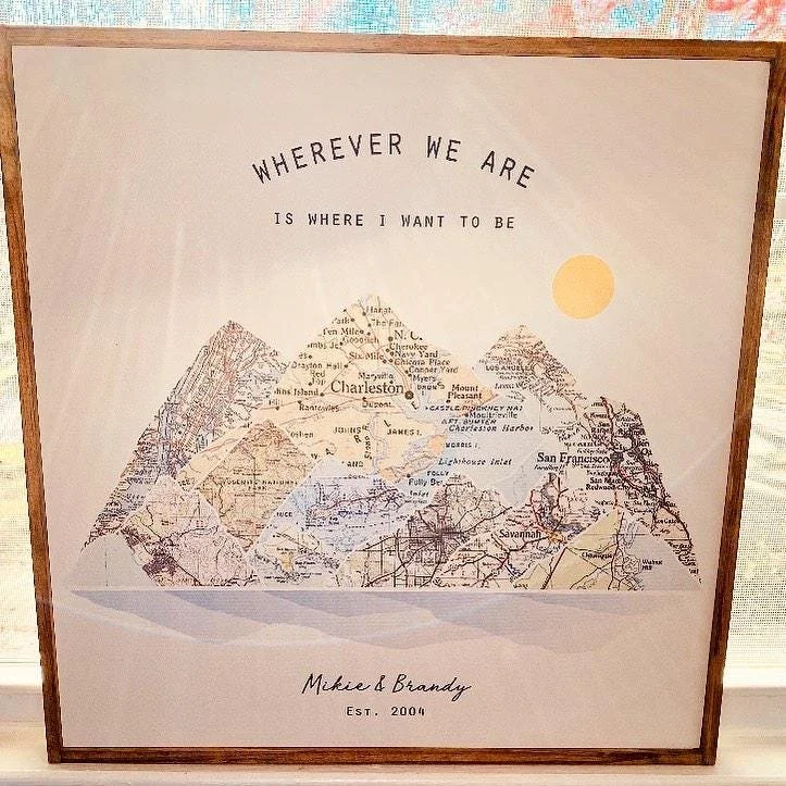 Cherish your journey together with a beautiful custom map gift, printed directly on wood! Personalize your wood mountain wall art with any specific locations in the world, your photo, and two names and a date or caption of your choice to create the perfect couples gift & travel decor.