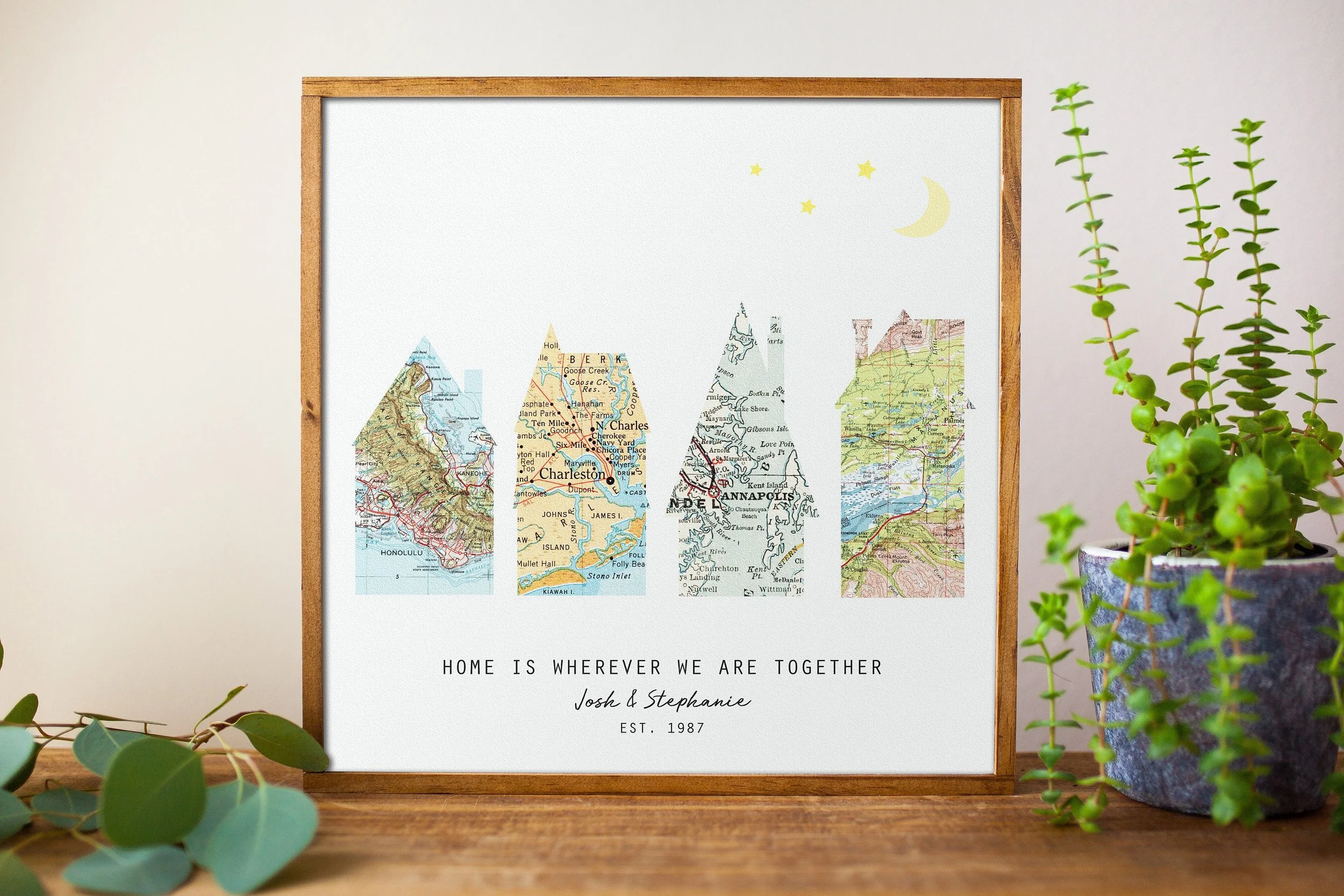 Featuring vintage map art of your location of choice, our custom wood signs make the most thoughtful personalized housewarming gifts, new home gift, moving away gift, new home gift, first home gifts for couples, or anything in between! From a cozy lake house to a modern apartment in the city, the timeless style of this custom map gift will add the perfect balance to the decor in your space. Caption on map print can be changed - just let us know in the order notes! Some popular suggestions are Home Sweet Home or Home is Wherever I'm With You!