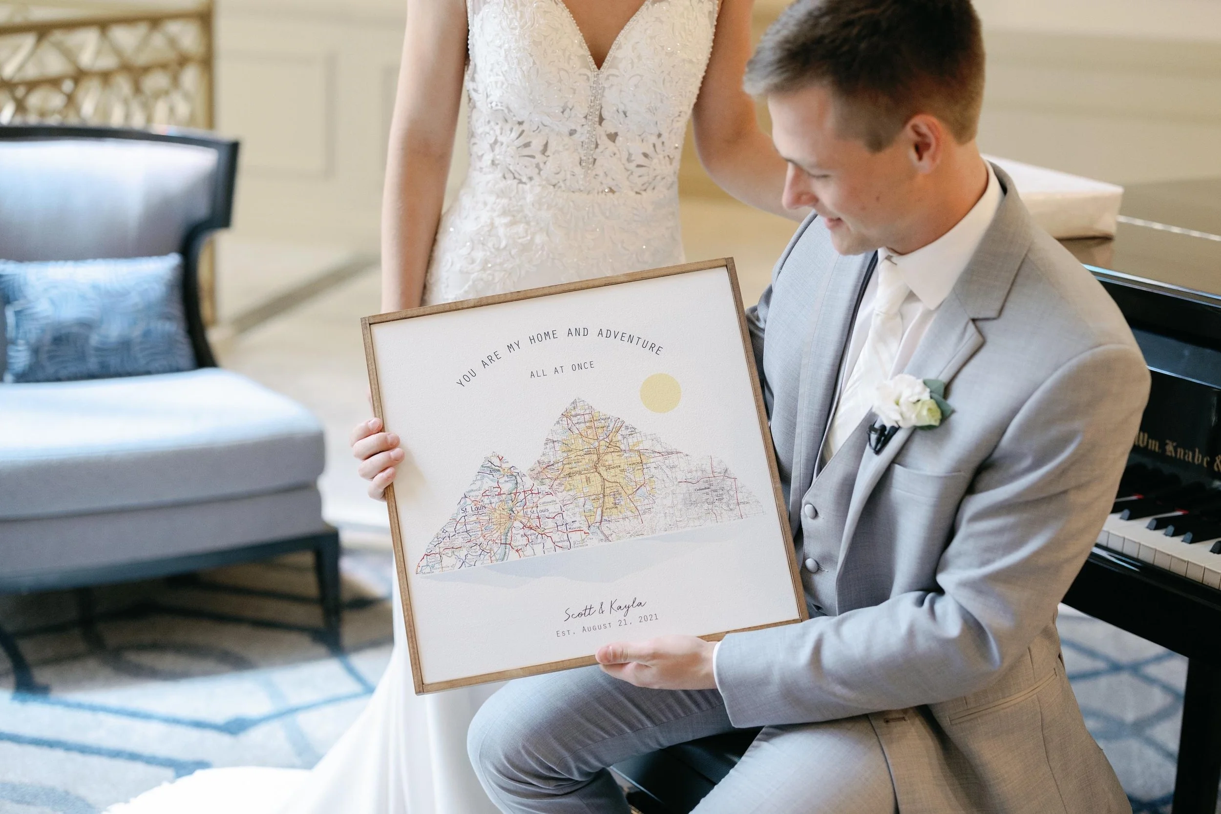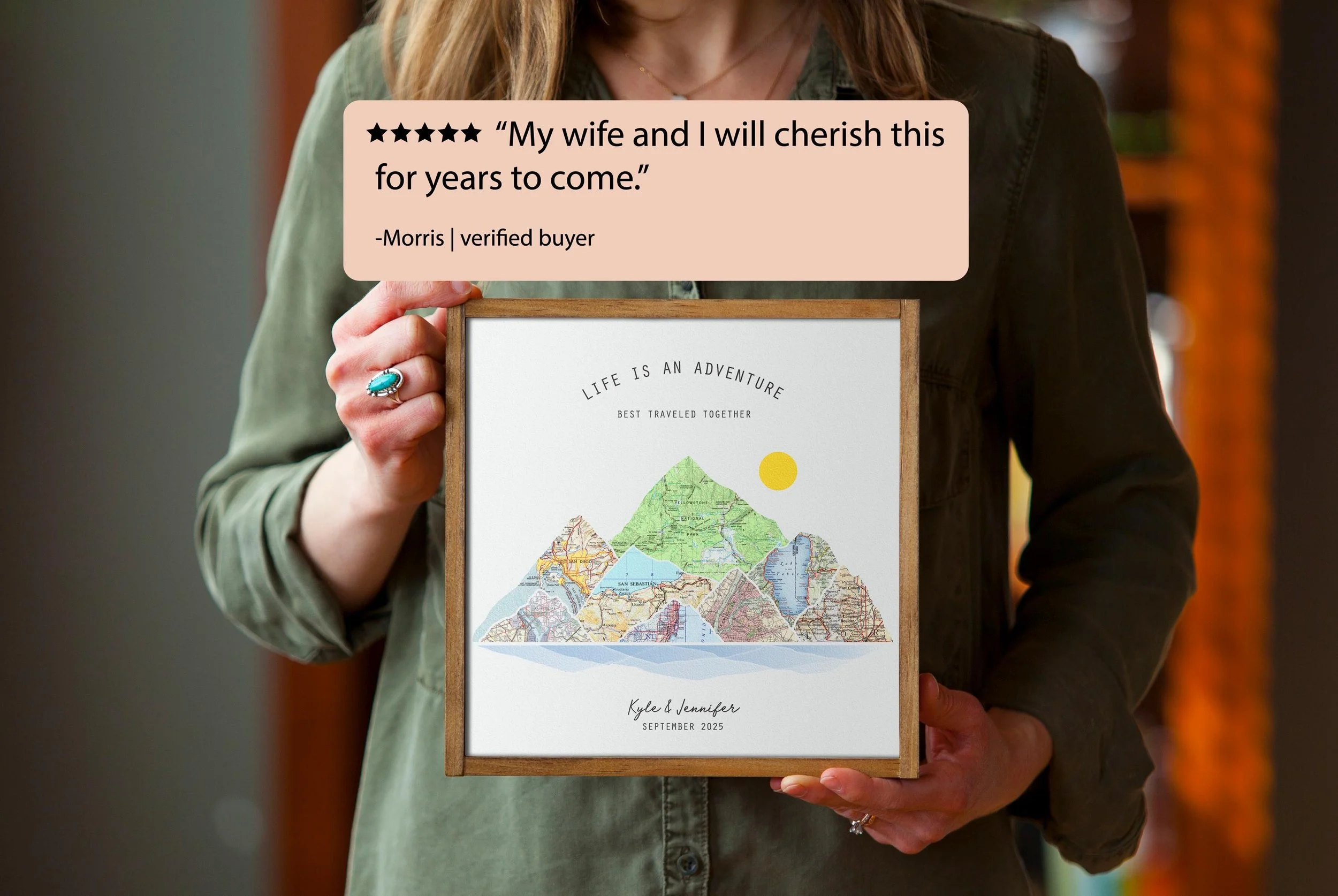 Our custom map art makes unique travel-inspired engagement/wedding gifts for couple, cute 5 or 10 year anniversary gifts for him (or 50th anniversary as gifts for parents!), personalized gifts for husband, wife, groom gift, or birthday gift for him or her. Our travel gifts feature favorite vacation spots, engagement/wedding/honeymoon locations, places lived, or places yet to go - the possibilities are endless!