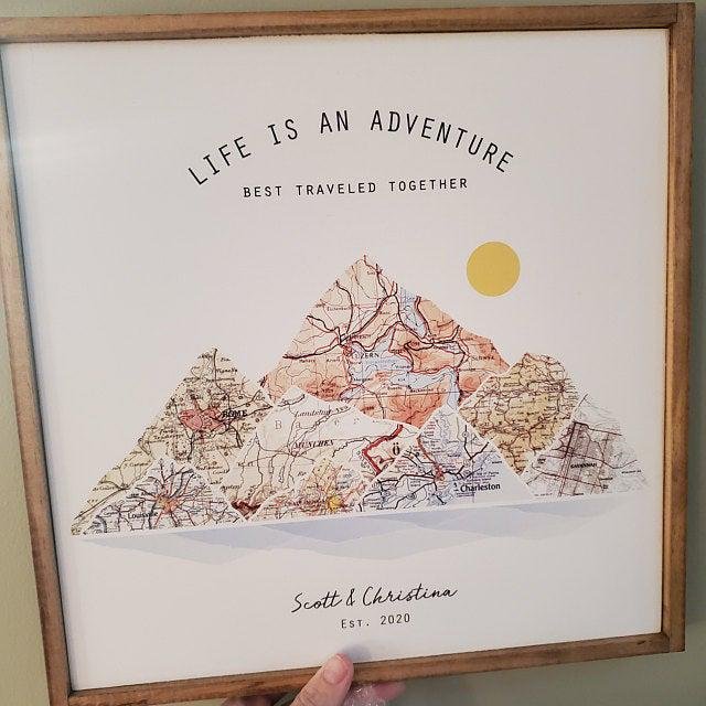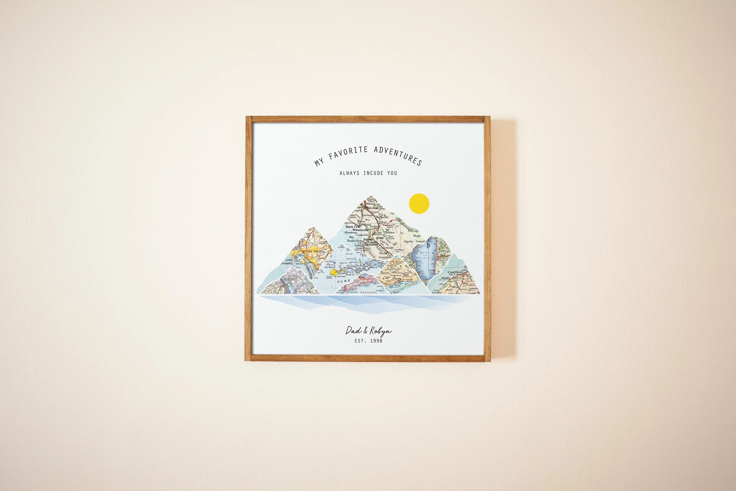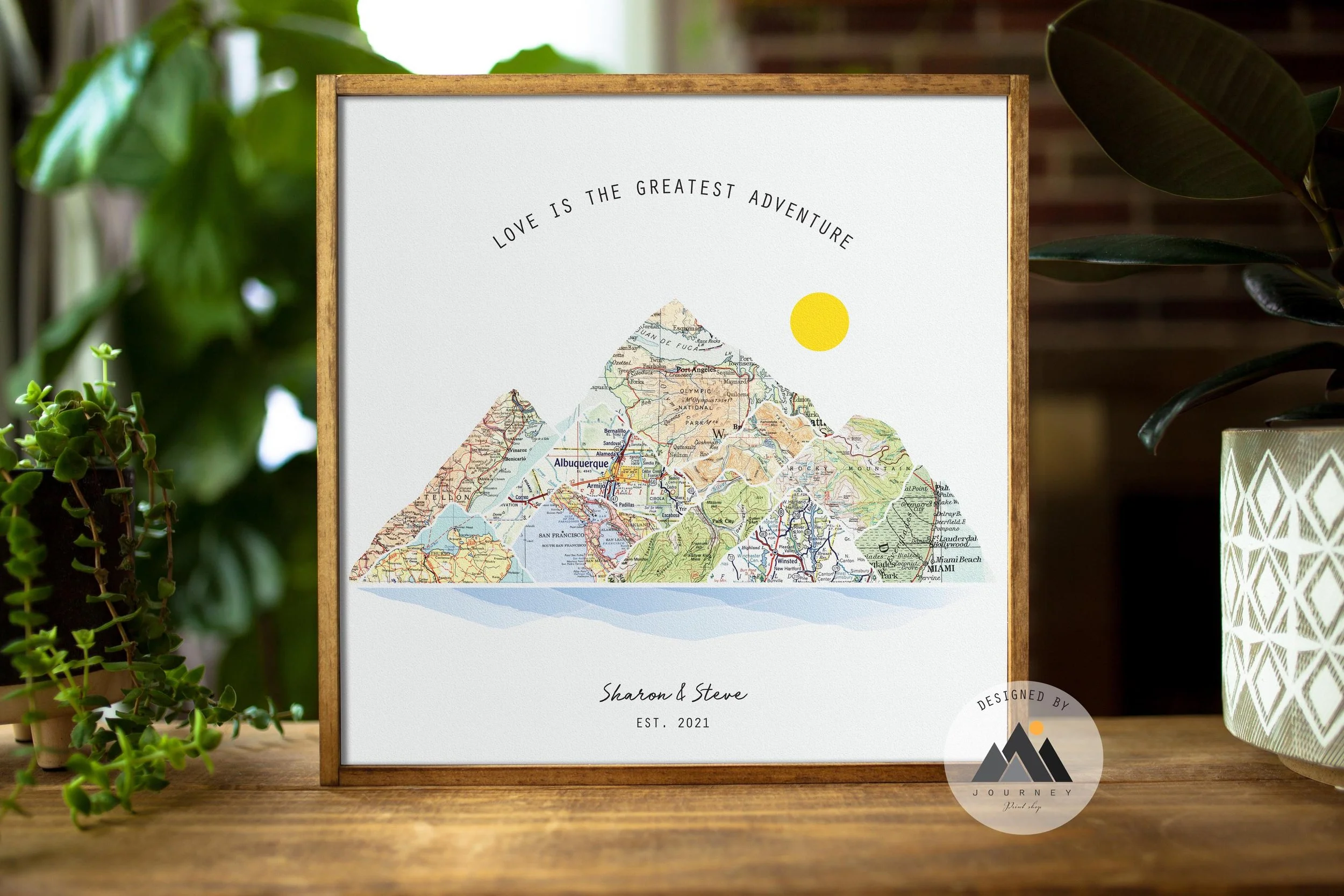 Adventure Awaits! Cherish your journey together with a beautiful custom map gift, printed directly on wood! Personalize your wood mountain wall art with any specific locations in the world and two names and a date or caption of your choice to create the perfect couples gift & travel decor.