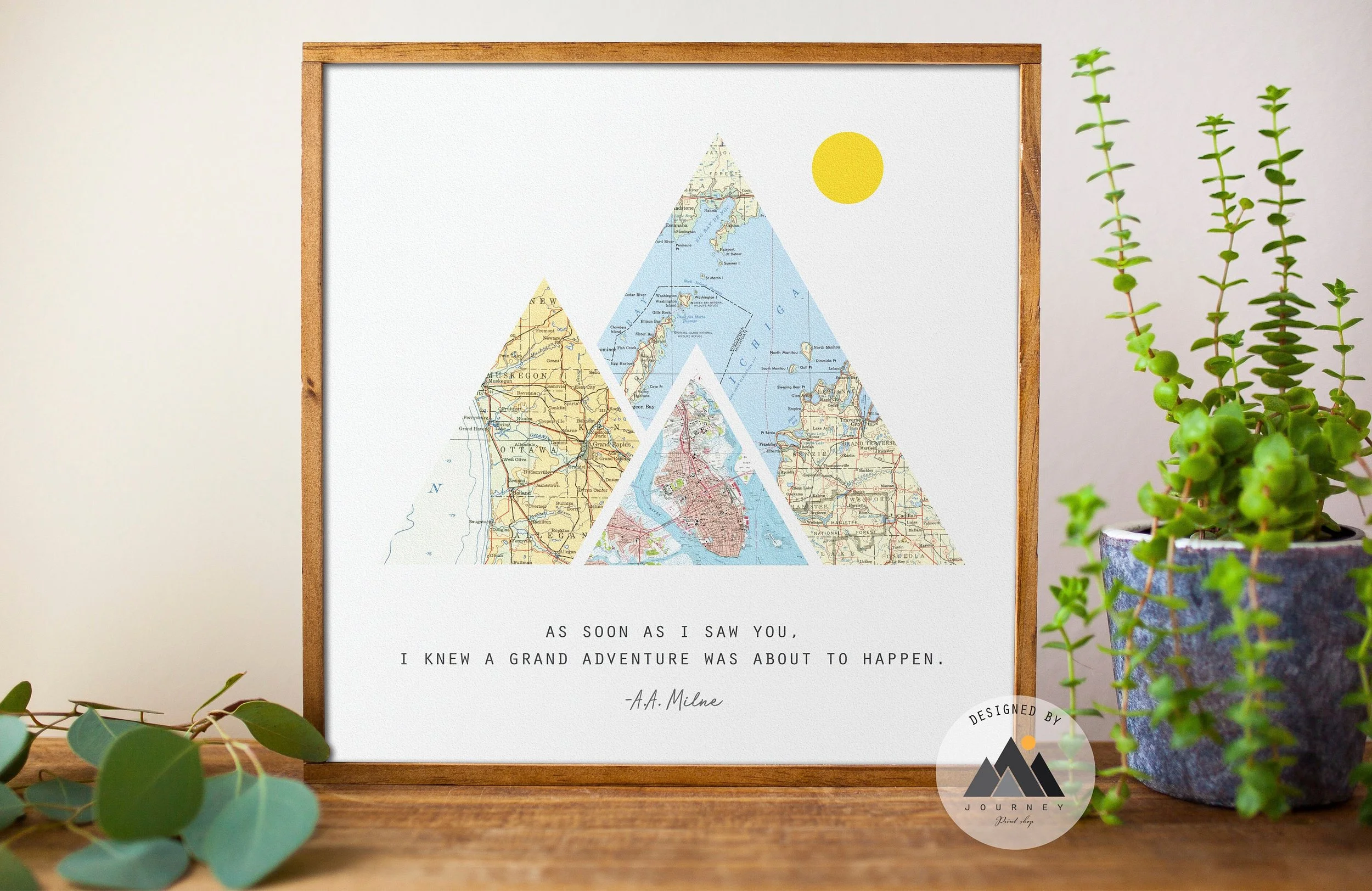 Cherish your journey together with custom mountain map wall art. Each piece is as unique as your story! Printed directly on wood, this personalized map print will make the most thoughtful 10 year anniversary, wedding gifts, engagement gifts for your favorite travel-loving couple, or birthday gifts for husband/boyfriend/girlfriend/wife. These are popular custom 50th anniversary gifts for parents to document their adventures together! Your geometric wood wall art can feature favorite vacation spots, places lived, or places yet to go - the possibilities are endless!